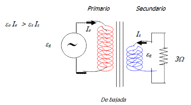 transformador de subida, la corriente en secundario se reduce para mantener la