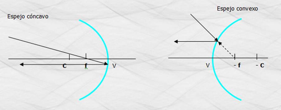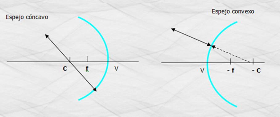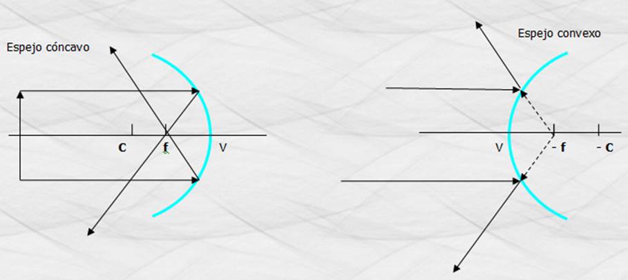 espejo cóncavo se reflejan paralelamente al eje; en el caso del convexo , los rayos no pueden pasar por el foco pero si se