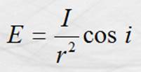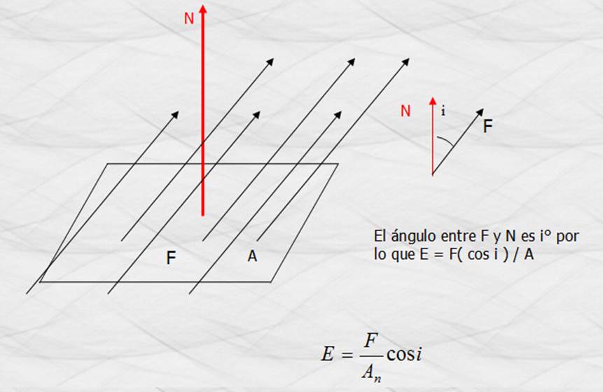 De igual forma, si el flujo es oblicuo a el área, la iluminación se multiplica por el coseno de i