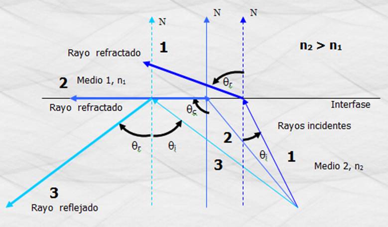 alejándose de la normal. El rayo 2 incide en la interfase al ángulo crítico o ángulo