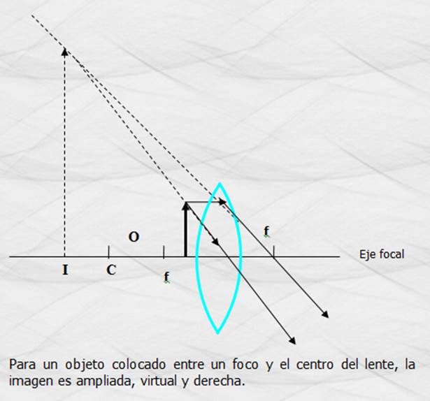 Figura 142. Objeto colocado entre el foco y el vértice de una lente convergente, y su imagen.