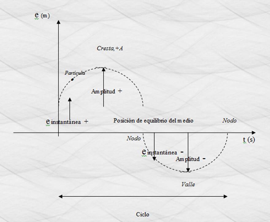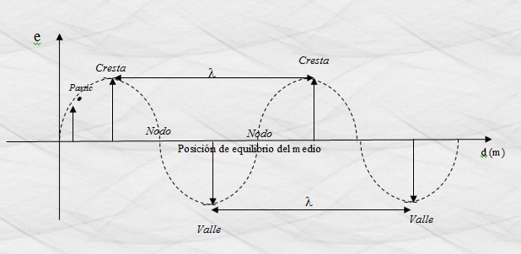 Las elongaciones importantes en una onda son: Cresta, es la amplitud positiva; Nodo es la elongación nula; y Valle que corresponde con la amplitud