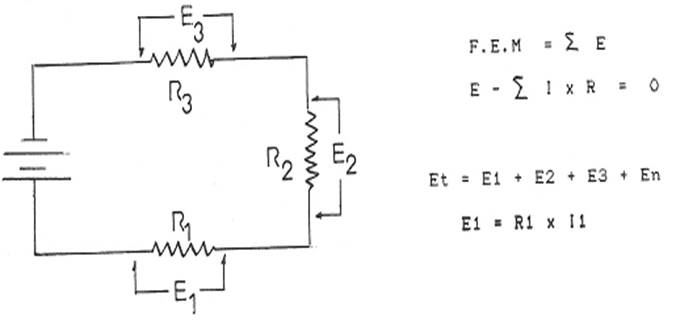 La segunda ley de Kirchhoff esta basada en el concepto de la conservación de la energía y se enuncia así: “LA SUMA ALGEBRAICA DE LAS DIFERENCIAL DE POTENCIAL ALREDEDOR DE UNA MALLA DE UN CIRCUITO ESIGUAL A CERO”. Con el fin de obtener la suma algebraica debe asignársele signo positivo a todas las fuerzas electromotrices en la malla y signo negativo a todas las caídas de tensión. (I x R).