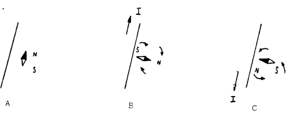 Oersted descubrió que una brújula colocada próxima a un alambre conductor de corriente se desviaba de su dirección normal Norte, Sur hasta adoptar una posición aproximadamente perpendicular al alambre.