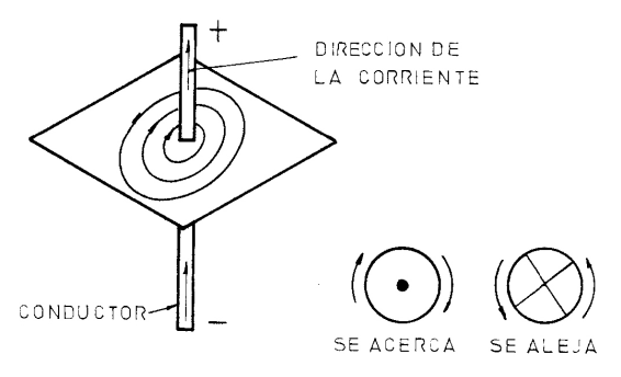 Las líneas de campo magnético alrededor de un conductor consisten por consiguiente, de una serie de círculos concéntricos indicando a la dirección en que un polo Norte magnético se movería alrededor de un conductor que transporta electricidad, si tuviera libertad de hacerlo.